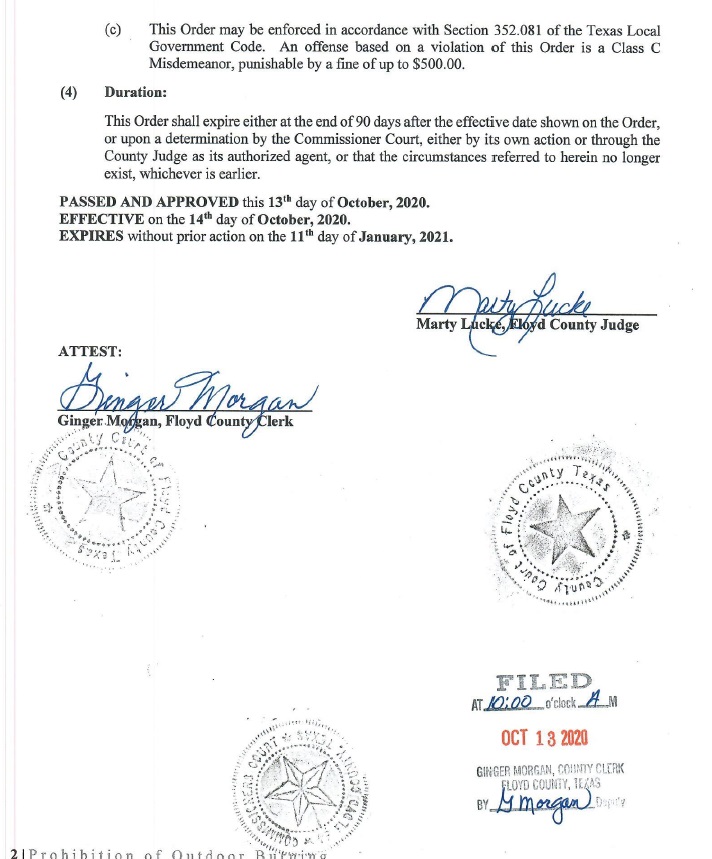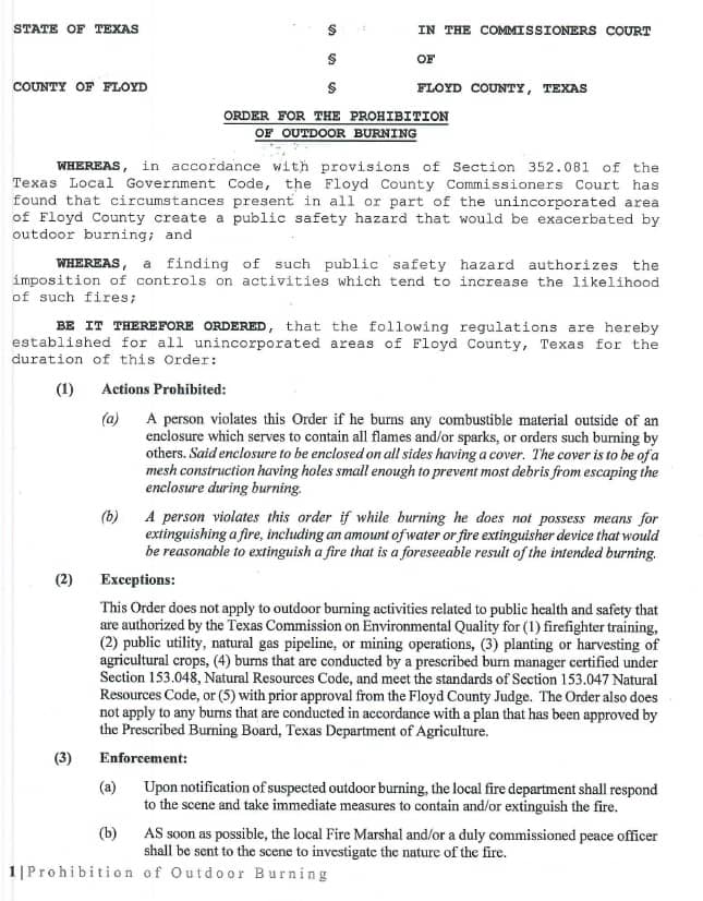 FLOYD COUNTY – Floyd County continues under a Burn Ban. Attached is the official Burn Ban declaration.